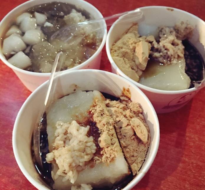 涼糕好吃,口感比一般的涼糕都要扎實(shí)綿密,而且加的黃豆面很細(xì)很好吃。玫瑰冰湯圓就是小湯圓加玫瑰花瓣加甜酒水加冰塊,比較特別。