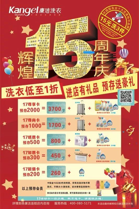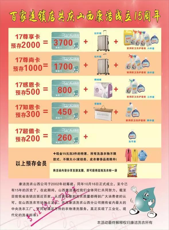 2.預(yù)存1000元,送1700元洗衣卡一張,還送拉桿箱一個(gè),再送家庭洗護(hù)4件套