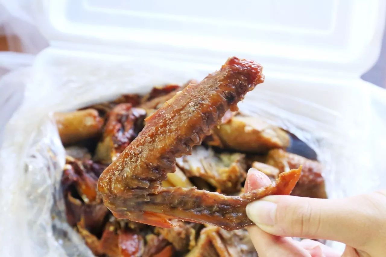 再掄起個鴨腿兒,看著這帶油的皮肉,就知道是個好腿啦~肉質飽滿脆嫩,一大口鴨肉也不塞牙,愛吃肉星人恨不得第一時間拿下這大腿小腿。