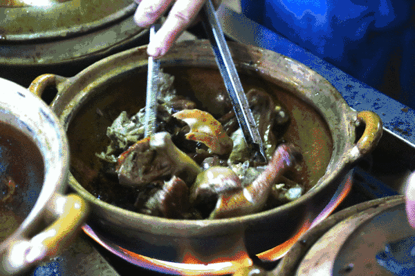 手速快到跟不上,加了酒,就在這小鍋里繼續(xù)翻炒,這鴨肉、鴨腿、翅膀、爪子……好不熱鬧,別看這幾滴酒,可把這姜母鴨的味道給整得穩(wěn)穩(wěn)的,保管你吃到每一塊都香氣滿分。