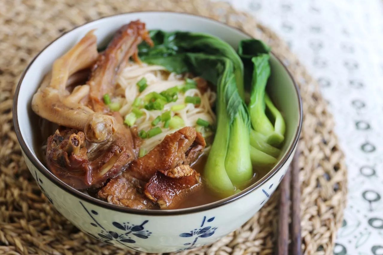 鴨肉連著姜片和湯汁一起加水燉煮成湯,再沖個面線,湯甜肉香,媽媽都不擔心我不吃飯了。