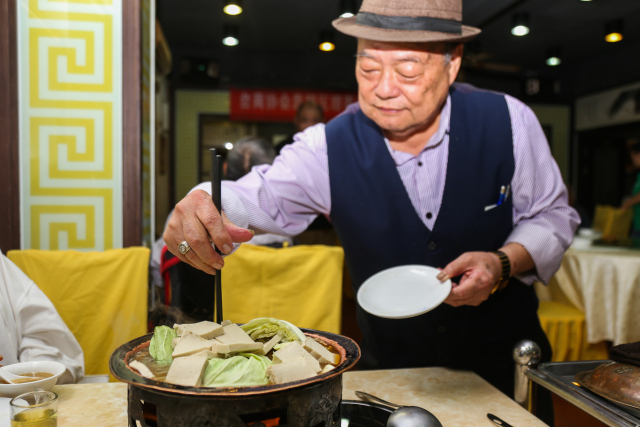 “漢宮姜母鴨是有服務文化的。”只見陳村金左手別在身后,右手輕拎開銅鍋蓋子,伴隨著濃濃蒸汽香飄四溢,陳村金用左手拿起湯碗,右手輕舀起鴨湯,為客人盛湯,全程至始至終面帶微笑。