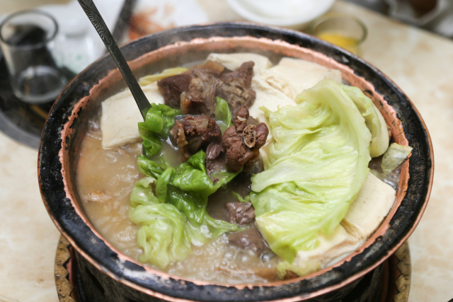 享用過第一道湯之后,就要涮入搭配的菜碟,臺灣高麗菜、鴨血、魚豆腐、粉絲,待沸騰后掀開鍋蓋,滿鍋的食材就要溢出來了,再喝一口湯就又是另一番風味了。