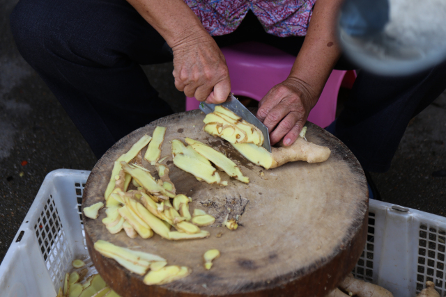 選用山東大姜, 纖維細,口感嫩,切得又薄又大片。這與本地姜是不同的,本地姜辛味偏重,纖維較粗。而用外地姜就可以多放更多的姜片,而不至于姜辛味過嗆,即達到了姜香味的效果,又可以吃到更多的姜片。這讓很多回頭客都心心念念不已。
