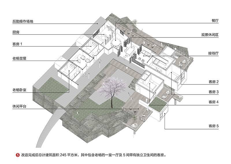建筑整體最終以散點(diǎn)的形式有限介入自然之中,新介入的元素不對原有的體系產(chǎn)生大的沖擊與破壞,新老元素之間相互借助彼此的優(yōu)勢,互為因借呈現(xiàn)一種最佳的狀態(tài)。
