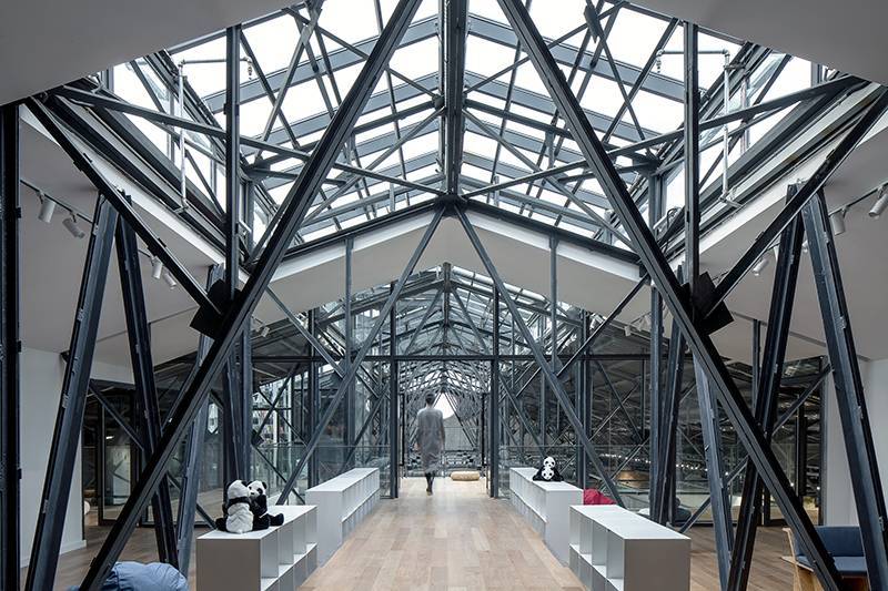 新建部分的鋼結(jié)構(gòu)主體與斜靠,猶如植物一樣,從半坡之上,逐漸向上生長。