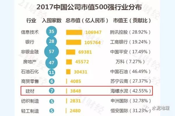 近日,21數據新聞實驗室公布了“2017年中國上市公司市值500強榜單”,海螺水泥以總市值1637.2億元名列第74位,在上榜的建材行業企業中位居第一,市值行業占比達到42.55%。