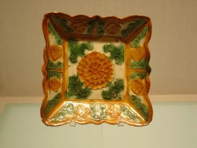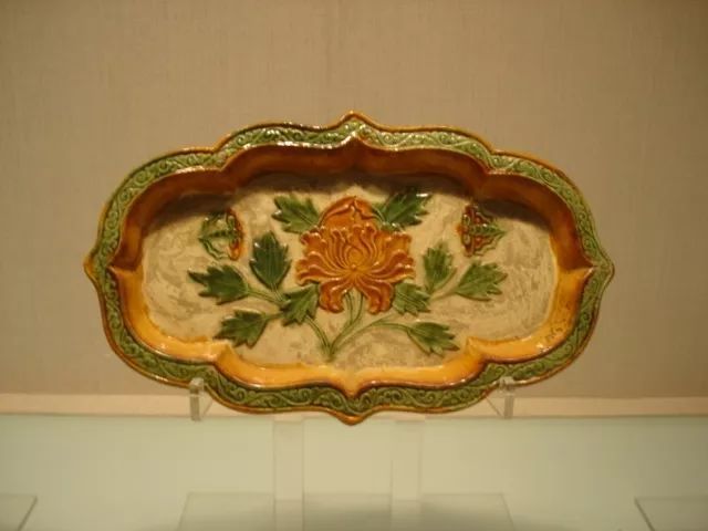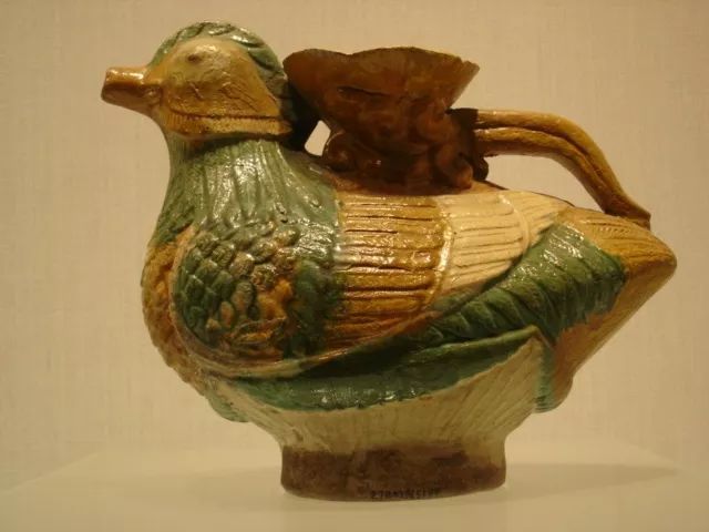 遼三彩還做出了一個三彩陶瓷發(fā)展史上的一個重要轉(zhuǎn)折,那就是將唐三彩以明器為主的局面,轉(zhuǎn)變?yōu)橐陨顚?shí)用器為主,有如穿帶壺、龜形壺、兔形壺、雞冠壺、海棠式長盤、蓮花式碟、印花暖盤、三角形碟等,這些器型都具有契丹民族風(fēng)格,這是我們鑒定遼三彩的一個依據(jù)。