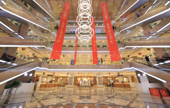 2017年“金葉珠寶在青島打造了一座黃金珠寶城”瘋轉朋友圈,寸土寸金的黃金地段,金葉珠寶強勢入駐青島原巴黎春天,一座5層樓的商場全部為金葉珠寶集團產品,華貴土豪程度令許多人驚嘆。商場內一至三樓為銷售區(qū),四樓為光明家具,五樓為珠寶批發(fā)及休息區(qū),整座商場黃金珠寶,流光華彩,熠熠生輝。