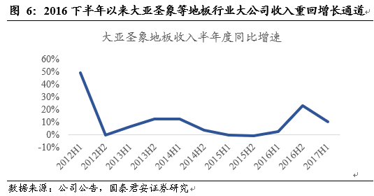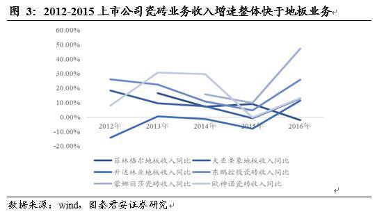 而這種替代效應(yīng)從微觀層面上也能得到類似驗證。2012-2015年,木地板上市公司的收入增速(深色線條系列)普遍低于瓷磚上市公司的收入增速水平(深色線條系列)。