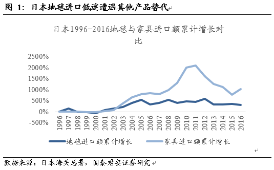 以2000年后的日本市場為例,隨著社會迅速老齡化與人們對衛(wèi)生要求的不斷提高,地毯產(chǎn)品由于不便清潔,易藏污納垢帶來疾病而遭遇市場冷落。從1996-2016年數(shù)據(jù)來看,日本地毯產(chǎn)品進(jìn)口額累計增速遠(yuǎn)低于同類的家具產(chǎn)品,我們推測其他競品對地毯產(chǎn)生了一定替代效應(yīng)。