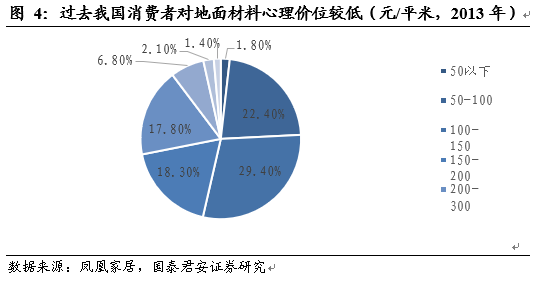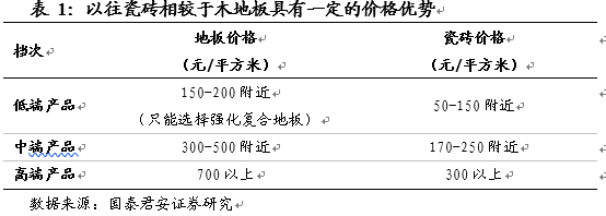 ①價格優(yōu)勢:過往10年國內(nèi)木材原料面臨較大的價格壓力,導(dǎo)致瓷磚具有明顯價格優(yōu)勢,例如200元/平方米的預(yù)算只能購買檔次較低地板(無法購買實木),但在選購瓷磚時已經(jīng)可以中端偏上的產(chǎn)品。彼時我國消費者對于地面材料的心理價位較低(與收入水平等也有關(guān)系),導(dǎo)致瓷磚對地板直接的替代效應(yīng)。
