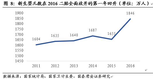 全面放開新生嬰兒數(shù)增速回升。隨著2015年開始全面放開二胎,2016年新生兒數(shù)量達(dá)到1846萬人,達(dá)到16年來的最高值,嬰兒出生量開始呈現(xiàn)觸底回升的趨勢。可以預(yù)見在不久的將來嬰幼兒在人口結(jié)構(gòu)中占比也將快速上升。