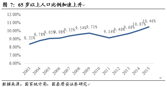 中國開始加速邁進(jìn)老齡化社會。根據(jù)統(tǒng)計局?jǐn)?shù)據(jù),2000年我國65歲以上人口占人口總比例達(dá)到7%,而2015年我國65歲人口占總?cè)丝诒壤呀?jīng)提升至10.5%,老齡化現(xiàn)象有加速的趨勢,我們認(rèn)為2020年我國老年人口比例可能升至15%以上。