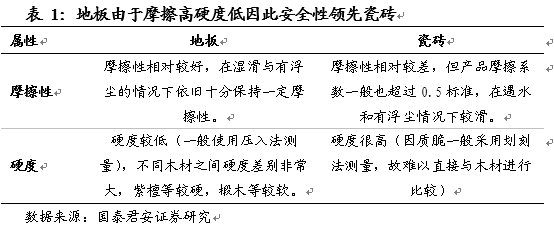 老年與幼兒人群對地面材料具有兩項相同剛性需求:安全性(防摔倒)與保溫性。而在這兩項性能上,地板相較于瓷磚具有絕對優(yōu)勢,因此我們認(rèn)為老幼人群對地板需求偏好將逐漸上升。