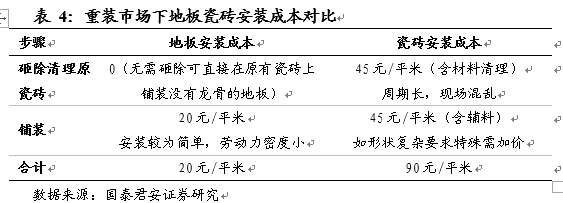 再裝修時瓷磚的安裝成本劣勢更加明顯。再裝修時,瓷磚地面可以直接安裝地板,但卻不可直接安裝瓷磚。例如在原裝有瓷磚的二手房內(nèi)計劃重裝地面材料,如想安裝新瓷磚需要先砸除原有瓷磚才可安裝新瓷磚,這需要更高的人力成本和更長的施工周期,并會造成施工現(xiàn)場的混亂;而如計劃安裝地板則只需直接在瓷磚上鋪裝地板,支付較低的施工費即可。根據(jù)我們測算,在此情景下每平米地板安裝費用可能比瓷磚拆后重裝節(jié)省60-70元左右。因此在完全成本上(包工包料),同樣檔次下鋪設(shè)木地板將比鋪設(shè)瓷磚更具有性價比,促使地板對瓷磚產(chǎn)生替代。