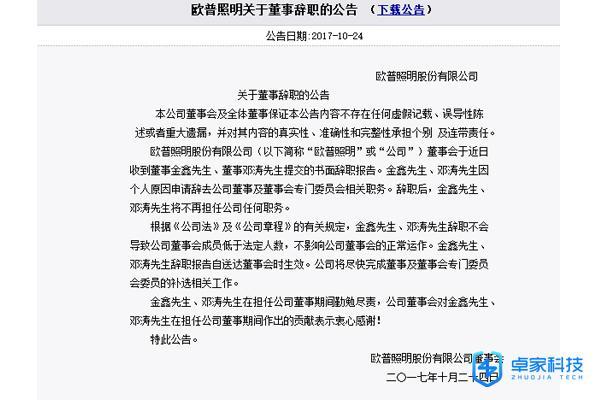 【歐普照明兩位董事辭職】