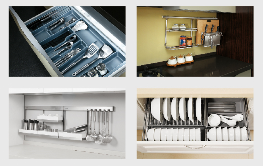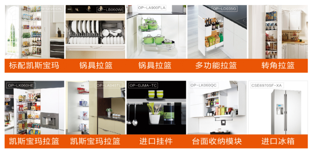 歐派櫥柜設計師設置配合不同的柜體使用各種特色拉籃,可全方位實現(xiàn)高效儲物。如灶臺拉籃可存放大小形狀不等的各類鍋具;抽屜拉籃的抽屜內可以設金屬格子,用于存放碗碟、杯子或者烹飪小工具;碗碟拉籃的底部設有擋水板,可干凈防水方便瀝干碗碟;多層結構拉籃可分區(qū)存儲,使得物品分門別類、井然有序;下拉式拉籃裝于高處吊柜,能自動伸縮,方便使用時下拉后取物,不必登高攀取。