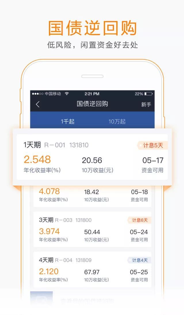 4. 國債逆回購:國債逆回購產(chǎn)品展示交易專區(qū)。再也無需輸代碼搜索啦。
