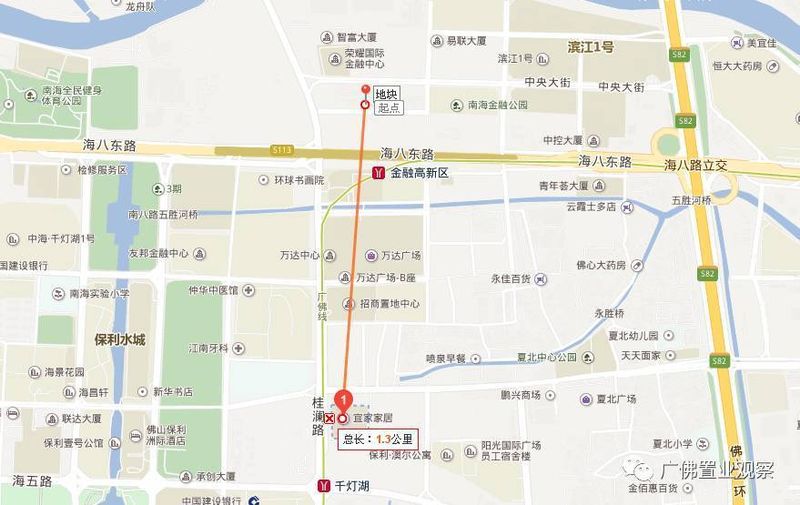 從衛(wèi)星地圖上測量,地塊與地鐵廣佛線金融高新區(qū)站直線距離不到500米,并與海八路立交距離約1.3公里,從地塊出發(fā)來往禪城、廣州中心較為方便。