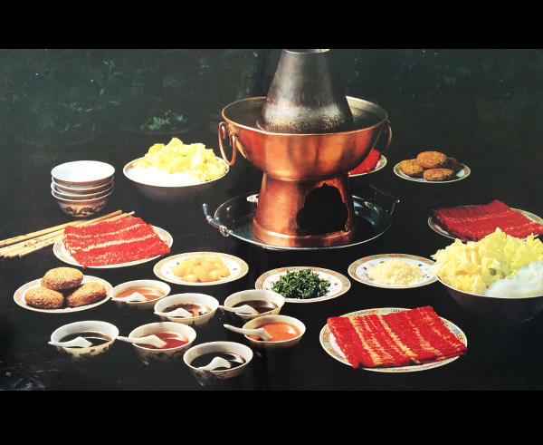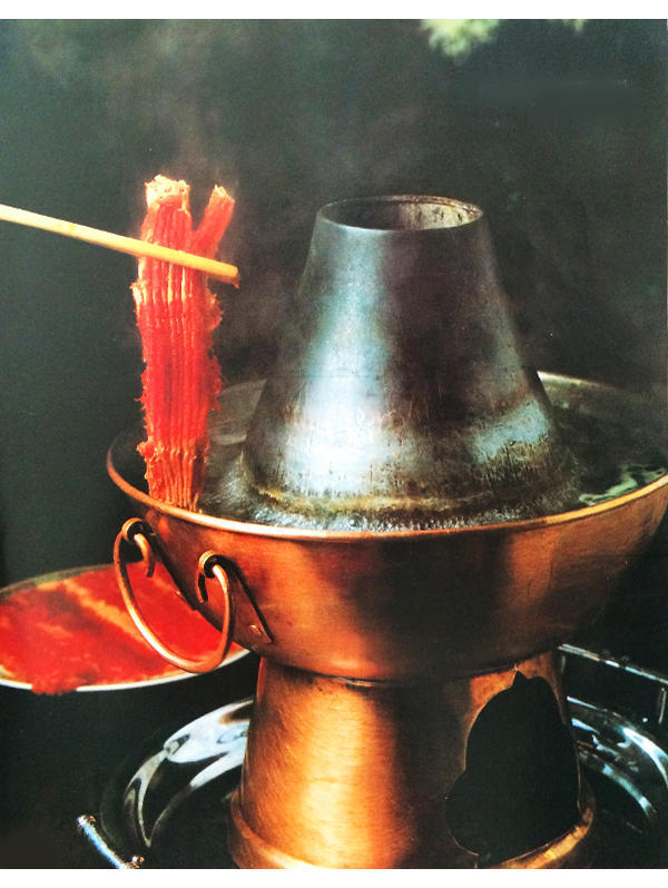 涮羊肉的豐富及特色,在于大桌中央聳立的火鍋,充滿中國(guó)的名族色彩。鍋為銅制,古色古香,又有如鏡子的反光,鍋中滾滾熱湯,火鍋周圍擺列數(shù)盤薄的羊肉片,紅色羊肉整然并列,有如婦人仔細(xì)織過(guò)的錦。有花紋的瓷碗里,盛著各種調(diào)味料,組合的材料正如:「嫩嬌嬌的白菜,細(xì)纖纖的粉絲。亮晶晶的糖蒜,翠滴滴的香菜。」構(gòu)成一副美麗的畫面,令人陶醉而不忍下筷翻動(dòng)。