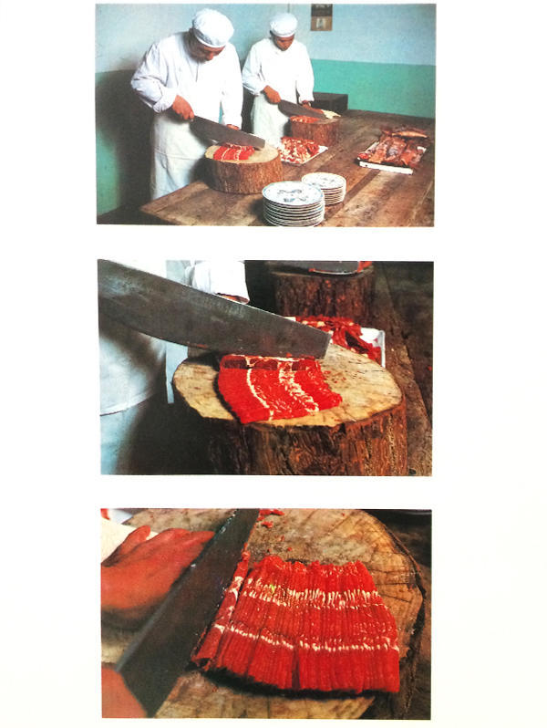 以專用菜刀,把涮羊肉用的羊肉,切成薄薄整齊的片狀