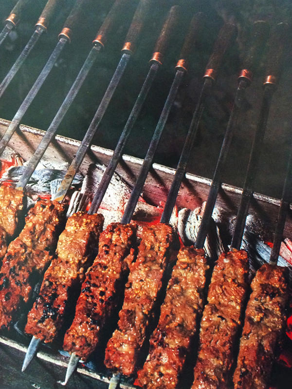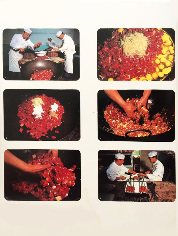 首先是材料選擇,此道北平「烤羊肉串」應(yīng)采用哪一部位的肉?需選擇最嫩無(wú)脂肪的部位,里脊肉是最理想的。把所選的里脊肉除筋之后,切成大塊,接著是第三過(guò)程的加味,再將切好的羊肉放入容器內(nèi),好好與雞蛋、面粉、芝麻仁、鹽、花椒水、細(xì)切的番茄、蔥頭、胡椒混合,為了入味,稍等片刻再烤(裸食注:這里的稍等片刻,其實(shí)是腌制一段時(shí)間的意思,大概是12個(gè)小時(shí)。)。其次串刺羊,把入味的肉塊一一用銀扦刺串起來(lái),一只銀扦以串六片或七片羊肉為宜,串得過(guò)多,則不易烤熟。最后用炭火炙烤。應(yīng)注意不要使火力過(guò)強(qiáng),稍許烤后應(yīng)翻過(guò)來(lái)烤,使兩邊烤得色澤相同,約三至四分鐘,使羊肉烤成茶色中稍帶紅色,便可以了。