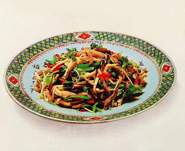 把生駝峰洗凈后放入鍋內(nèi)煮上二、三個(gè)鐘頭,再與雞鴨湯煨上三十分鐘以上,最后等冷卻后切絲,副材料玉蘭片、青紅柿子椒、香菇也切絲,再用沸水燙過(guò)。再加強(qiáng)火力,把雞油放入鍋內(nèi)熱鍋,放蔥絲、姜絲、蒜片、八角,等溢出香味后取出,再把駝峰與副材料的玉蘭片等同時(shí)放入,攪拌數(shù)次,放進(jìn)香菜、酒、鹽及少量芝麻油。