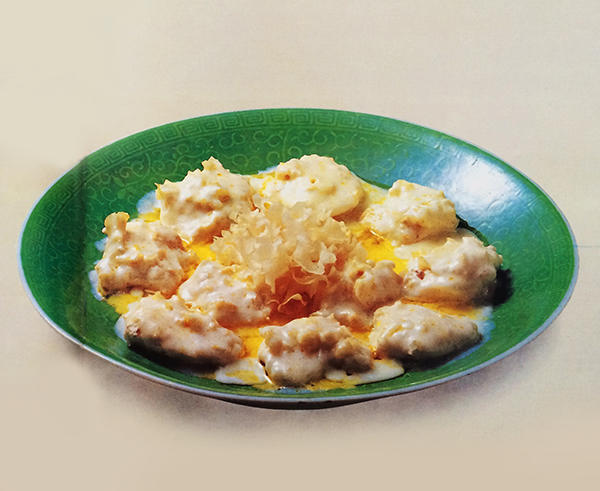 先除去雞里脊肉的筋,剁成茸狀。去除泡好的銀耳的硬根部,洗凈,把水濾掉。接著將雞茸、銀耳(留下一部分大的)放入大碗。先加酒攪拌,其次倒入起泡的蛋白,好好拌勻。加火把鍋里的水煮沸,再把做成凝固狀的「雞茸銀耳」放入鍋中,熱后取出,浸入冷水,去泡,把鍋洗凈后,加強(qiáng)火,放入雞湯,煮熟后再并排似地放入「雞茸銀耳」,放入牛奶、姜汁、鹽、酒,等煮沸時(shí),慢慢搖動(dòng)鍋?zhàn)樱犹追酆蓾夂隣睢A苋腚u油,并排于盤上,中央裝飾著銀耳即成。