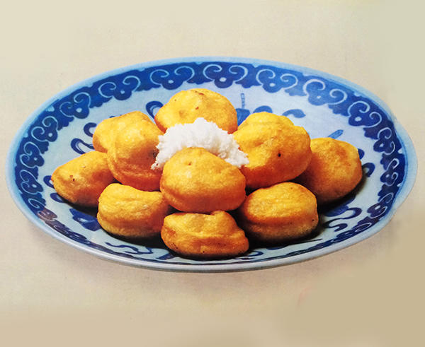 「炸羊尾」是用雞蛋清、豆沙餡做成的甜食,為清真菜一種。材料并非羊尾,稱為「炸羊尾」是有原因的。以前清真館子的「炸羊尾」確用羊的尾巴做成的,但羊尾油膩,腥味重,因此不怎么受歡迎。廚師便改用豆沙餡,但形、色都保持原來(lái)的樣子,名稱依然不變,結(jié)果反而大受贊賞,成為名菜之一。