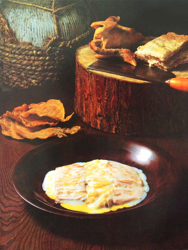 大盤「雞茸銀耳」如雪一般,正中裝飾的銀耳有如盛開(kāi)的牡丹,純白的湯上,浮著明亮的黃色雞油,給人名雅高貴的印象,有如藝術(shù)家的作品。