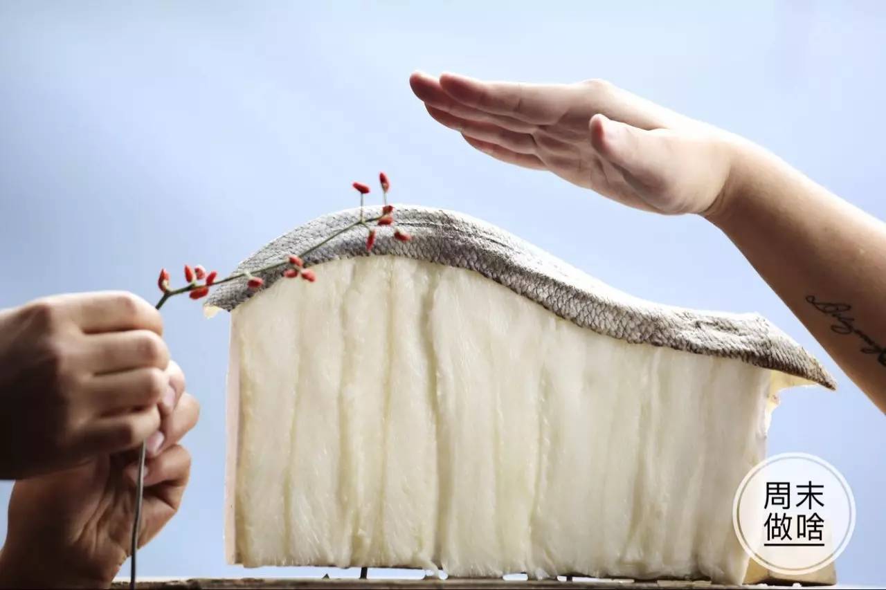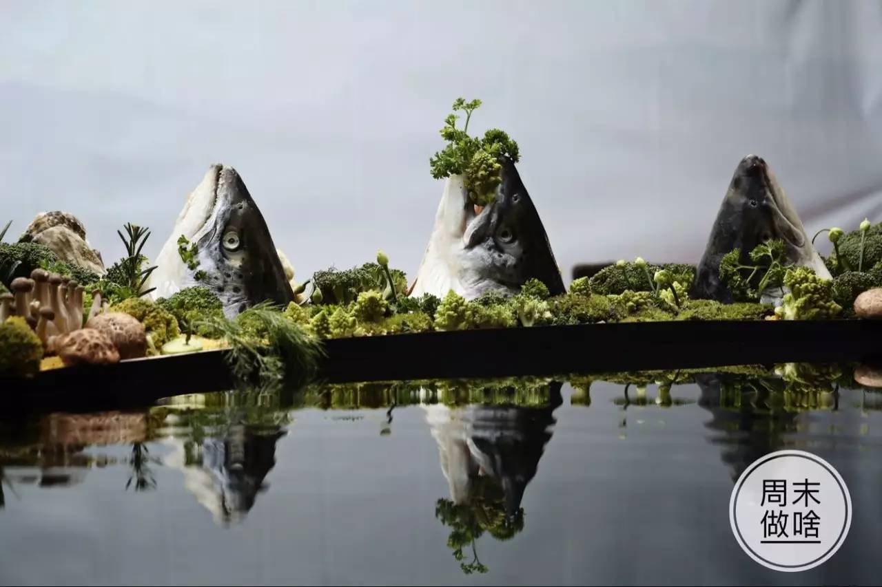 “山”還好解決,將巨大的三文魚頭表皮斷生,隨后再用蒸汽熨斗將表皮熨平,黑白灰的山,就這么出現(xiàn)了,是不是美不勝收~