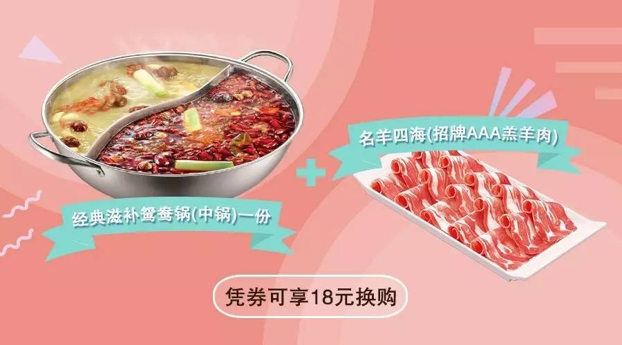 ?2017年8月11日-27日,活動期間憑券前往活動門店,可享以18元價格換購“經(jīng)典滋補鴛鴦鍋(中鍋)”一份+“名羊四海(招牌AAA羔羊肉)”一份