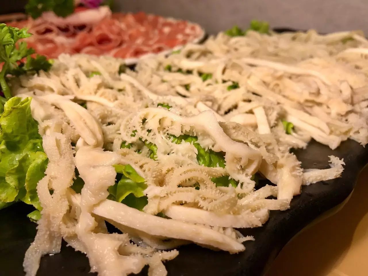 下鍋的毛肚像面旗子一樣漂在湯面上,就算不小心燙過頭了,吸滿湯汁的毛肚入口依舊爽脆,不是鮮貨絕對(duì)做不到!