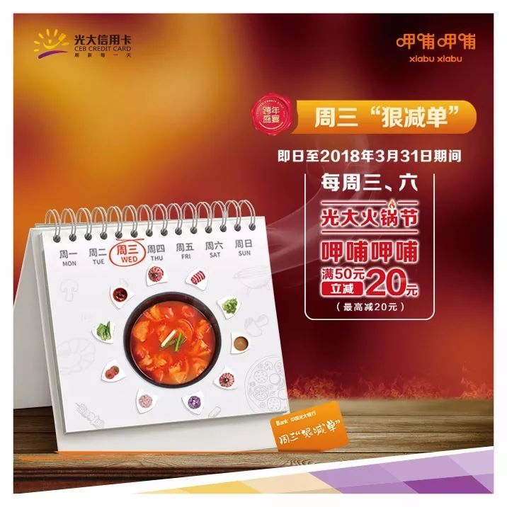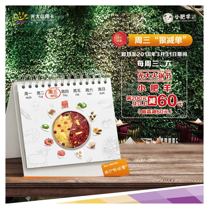 活動期間,客戶在全國指定小肥羊門店消費并刷我行信用卡,即享滿200元立減60元優(yōu)惠。每活動日名額1511個,每位客戶每活動日限享一次優(yōu)惠,名額有限,先到先得。