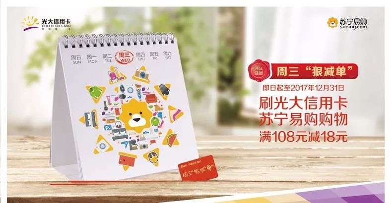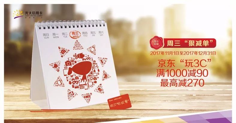 活動期間,每周三,持光大高端卡在京東商城3C頻道購買實物類商品(不包括二手商品),可享單筆交易每滿1000元立減90元優(yōu)惠,最多可減270元。每人每自然月限1次,每活動日限前1500個名額。