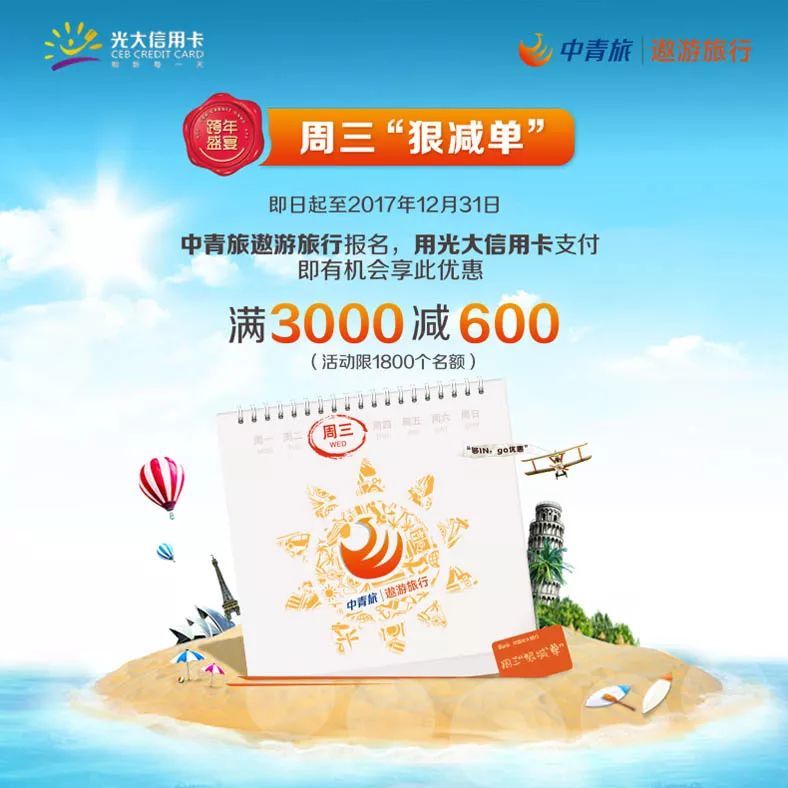 使用光大銀行信用卡通過中青旅遨游旅行指定渠道(含門店、PC、WAP及APP等但不限于)全額支付指定旅游路線的團費,即有機會享滿3000元及以上立減600元的優(yōu)惠。活動限1800個名額。