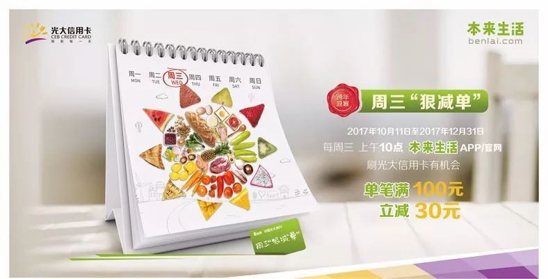 活動期間,客戶在本來生活手機APP客戶端或官網(wǎng)消費購買任意產(chǎn)品(不含充值會員賬號), 通過光大信用卡全額支付即有機會享受單筆滿100元立減30元的優(yōu)惠(最高立減30元)。每位客戶每活動日僅限參與一次,每活動日優(yōu)惠名額為5555個,名額有限,先到先得。