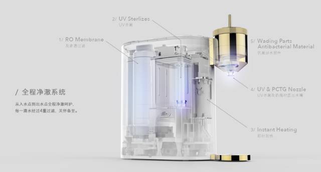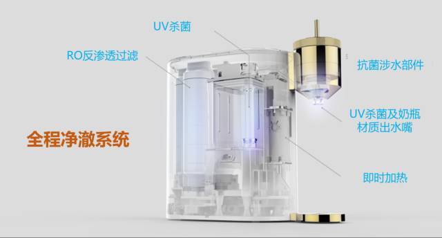從入水點到出水點全程凈澈保護,每一滴水經(jīng)過5重過濾,歷經(jīng)陶氏RO膜等多級濾芯,食品級涉水部件,UV照射殺菌,開啟瞬間即刻達到選擇溫度,奶瓶材質(zhì)出水嘴配合UV消毒,關(guān)懷至杯。