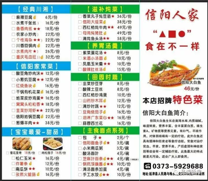 “信陽人家”,地址位于延津縣人民路與棉棟路十字路向北50米路西。以信陽特色菜為主,所用主要食材,均由信陽當(dāng)?shù)匕l(fā)貨。