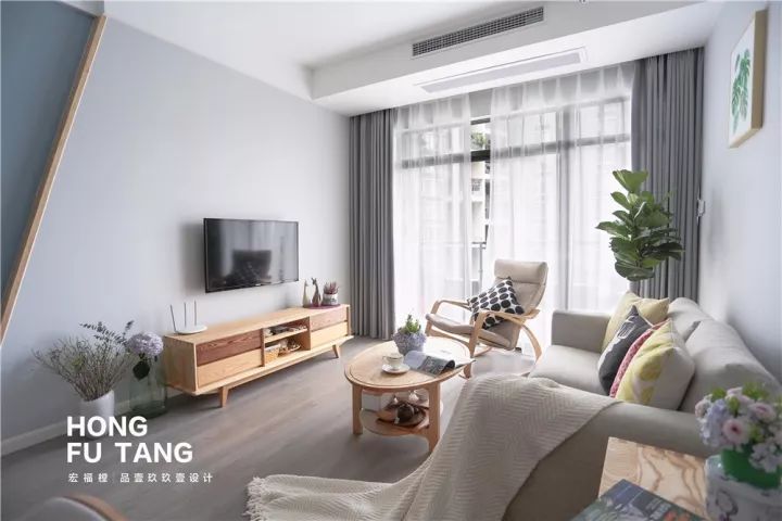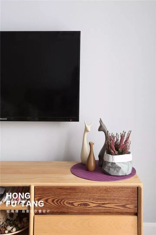 △原木色的茶幾和電視柜,米色的沙發(fā),吳先生最喜歡的是一把并不昂貴的搖椅。午后陽光,喝著清茶或者飲料,看看落地窗外的綠植,或者享受閱讀的慢時(shí)光。