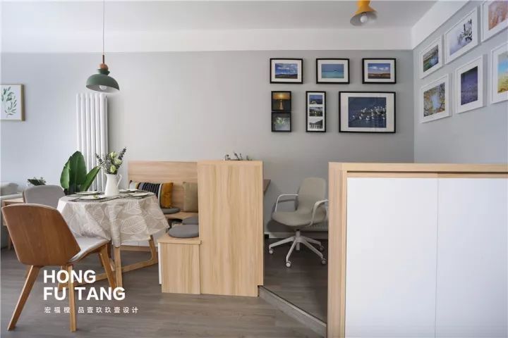 ?\u00A0將餐廳和入戶部分區(qū)域劃分成開放式書房,也增加了儲(chǔ)物區(qū)域和鞋柜。
