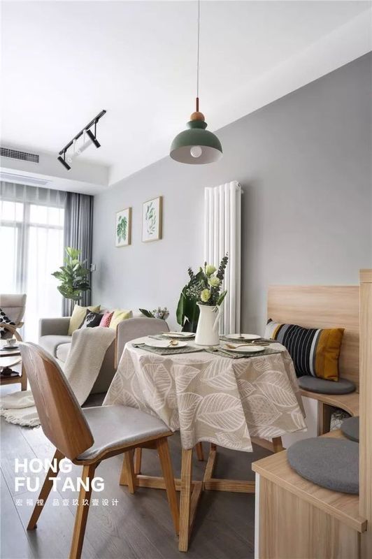 △餐廳和客廳在同一個(gè)空間里,靠墻一側(cè)定制了一個(gè)L形的卡座,一側(cè)儲(chǔ)物,另一側(cè)變身為書桌。