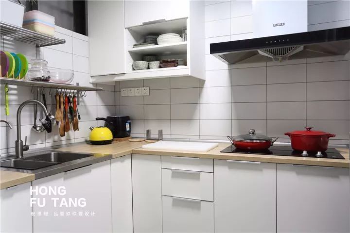△廚房是清爽的白色,原木質(zhì)感的臺(tái)面來自宜家,作為烘培愛好者的王女士有很多大大小小的料理工具,這樣一個(gè)廚房完全滿足了收納的要求。