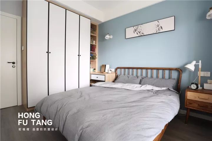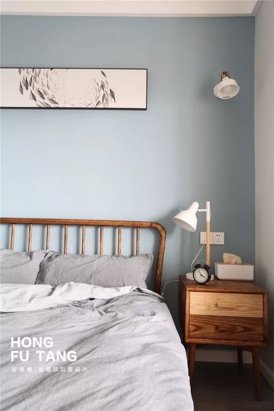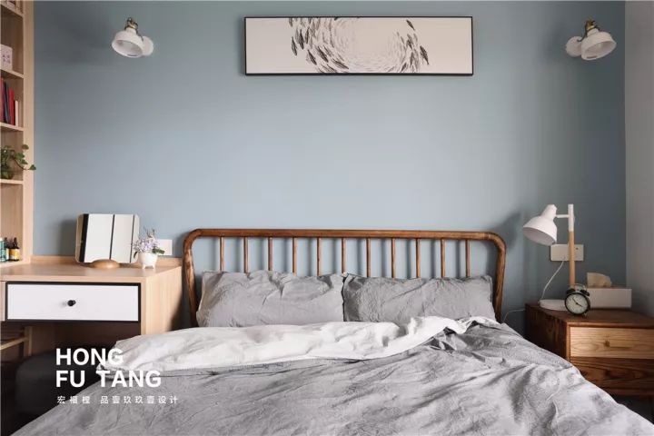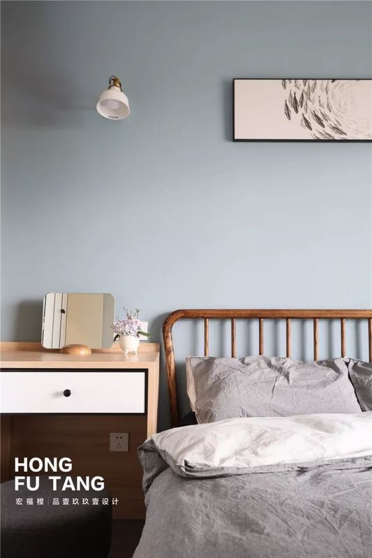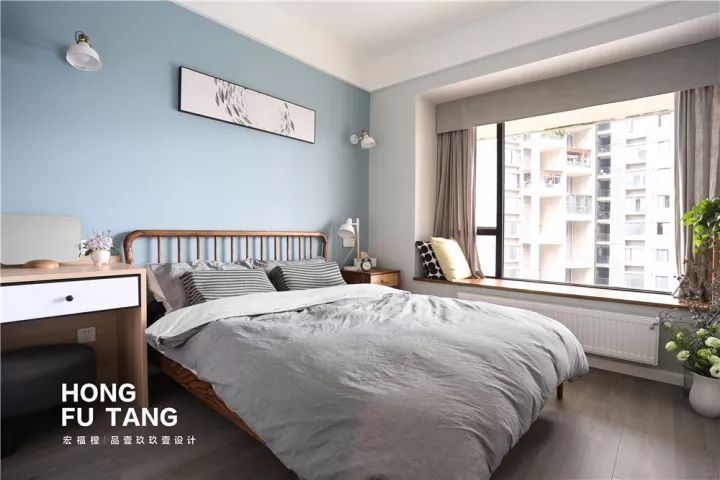 △主臥淡藍(lán)色的墻面,褐色的胡桃木大床為空間注入了沉穩(wěn)的氣息。飄窗臺(tái)舍棄了傳統(tǒng)的石材飄窗,選擇了更有質(zhì)感的老榆木,讓這個(gè)休憩小空間更加溫暖。