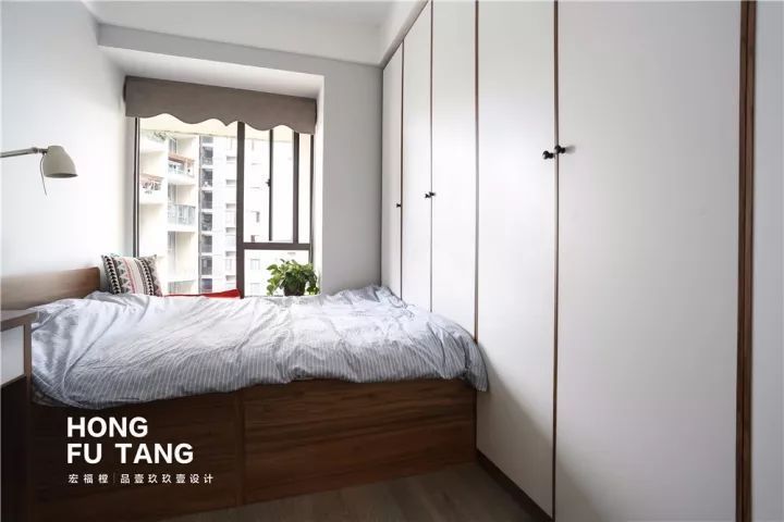 △老人房的儲(chǔ)物空間也十分強(qiáng)大,榻榻米床加上一整面墻的衣柜,最大限度地利用了空間。