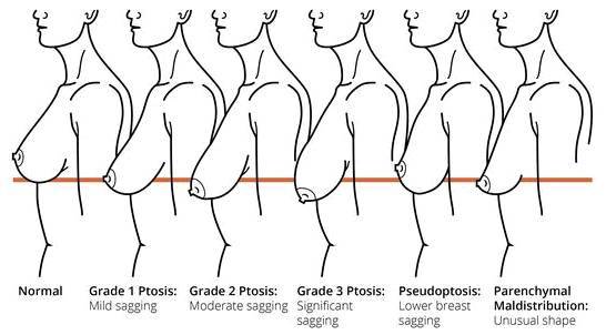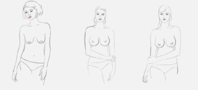 但是從側(cè)面看,一對比,就能有個直觀感受了。如果乳房最低點,甚至乳頭,和最左邊的正常胸型相比低很多,而且向下垂的傾向嚴重,那你也許真的有這個問題了。