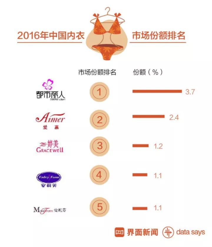 黛安芬、華歌爾、愛慕、安莉芳、曼妮芬這些熟悉的品牌,至今還占據(jù)著2016年中國(guó)內(nèi)衣市場(chǎng)的十大品牌的前八。從名字上看,“芬”“芳”的密集使用,除了考驗(yàn)眼力和口條之外,也都詮釋“女人花”的閨房氣息。