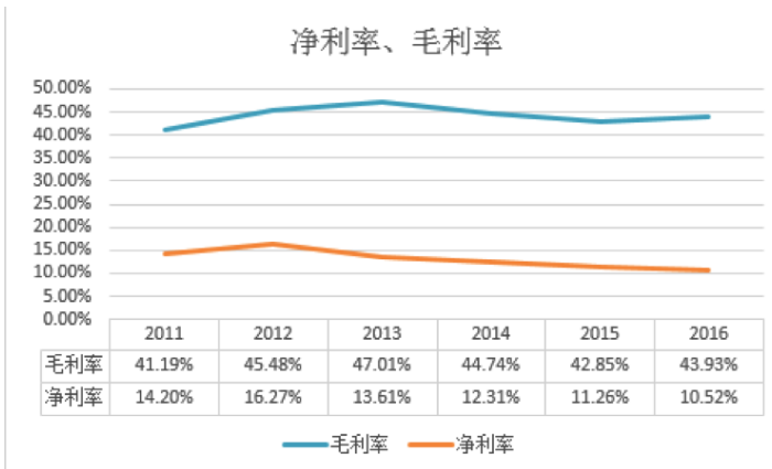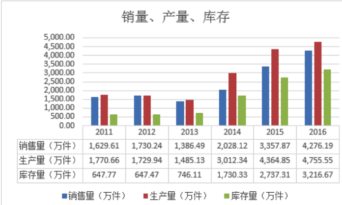 從上圖看,2011到2013這三年,銷(xiāo)量和產(chǎn)量的差距并不大,庫(kù)存比較穩(wěn)定,但14、15年產(chǎn)量比銷(xiāo)量猛增一大截,導(dǎo)致庫(kù)存立馬上升,16年雖然銷(xiāo)量和產(chǎn)量差距縮小,但庫(kù)存已經(jīng)壓下。庫(kù)存與門(mén)店數(shù)量減少密切相關(guān),這批加盟店的庫(kù)存在線下,在七匹狼品牌店內(nèi),可以說(shuō)是沒(méi)有出頭之日了。