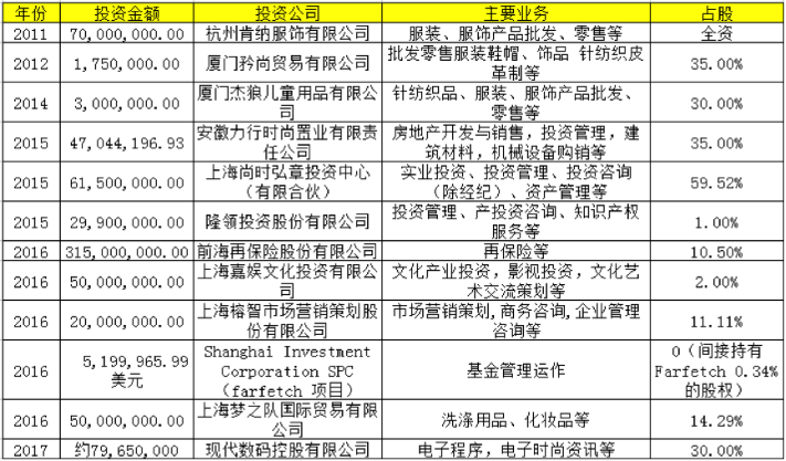 杭州肯納服飾有限公司,取得奢侈品品牌范思哲、康納利、喬治杰生在中國(guó)的代理業(yè)務(wù);Shanghai Investment Corporation SPC(farfetch項(xiàng)目),入股國(guó)際時(shí)尚電商平臺(tái)Farfetch;現(xiàn)代數(shù)碼控股有限公司,《周末畫(huà)報(bào)》母公司現(xiàn)代傳播的子公司。